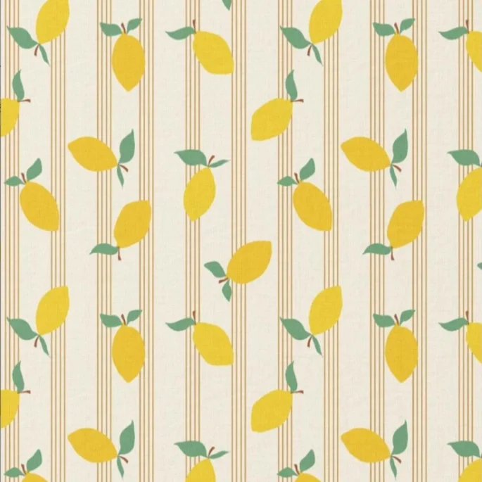 | Χρώμα/Σχέδιο:Εκρού φόντο με σχέδια ρίγες μουσταρδί και κίτρινα λεμόνια περίπου 2.50cm x 5cm με πράσινα φύλλα |