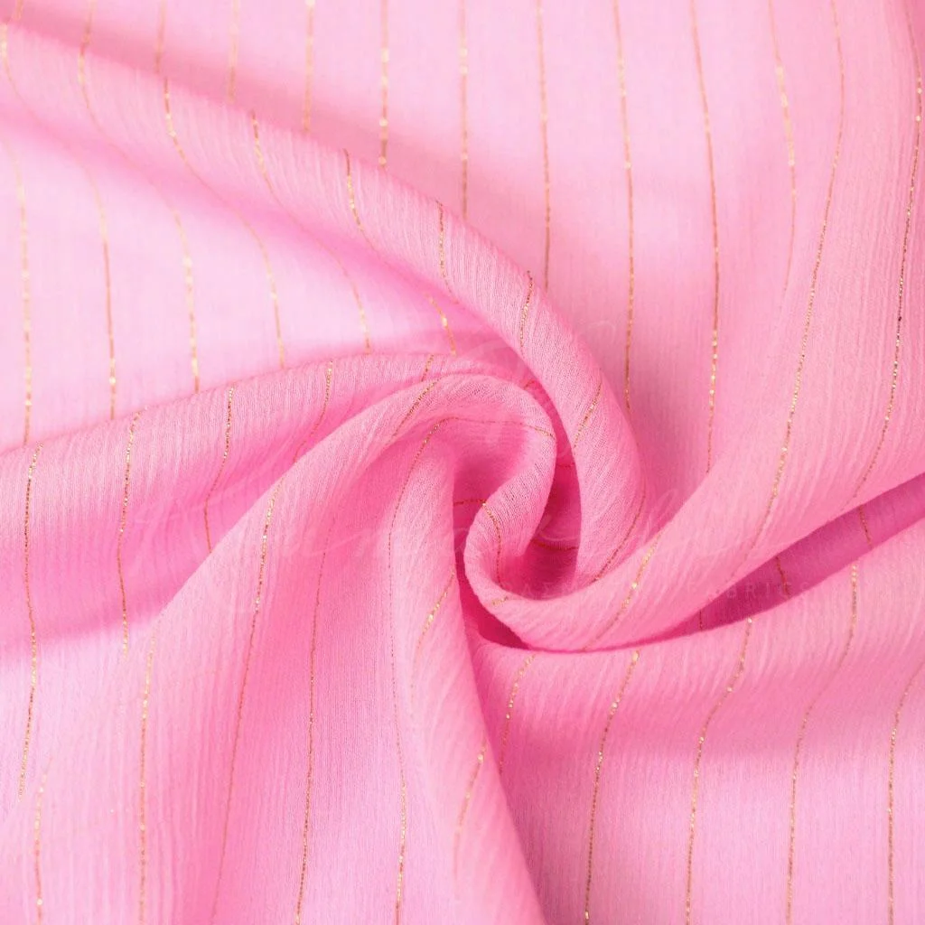 Lightweight and elegant muslin with delicate vertical silver-gold stripes that add a subtle shimmer and a sense of movement. Made from high-quality synthetic fibers, this fabric is stable, sheer, and beautifully fluid, with a soft texture and a slightly crinkled (gaufre) surface. It drapes gently over the body and offers freedom of movement. An ideal choice for summer looks and statement accessories. It can be worn on its own or layered over other fabrics for multi-dimensional and eye-catching outfits.
