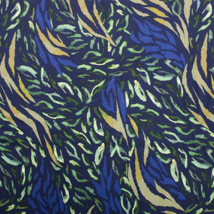 Color/Pattern:Deep blue background with an irregular seaweed pattern in blue. green. yellow. and white